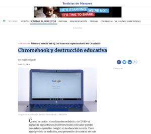 “Como es sabido, el confinamiento debido a la COVID-19 aceleró la implantación del Chromebook (ordenador portátil con sistema operativo Google) en la educación navarra. Ya en aquel período de reclusión, esta pretensión de sustituir sin más la docencia directa con la tecnología trajo problemas serios a niños, padres y profesores.