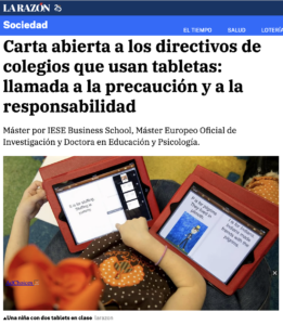 “Muchos padres están preocupados por las implicaciones de la sustitución de los libros por las tabletas. A lo largo de los últimos 10 años, he recibido cientos de correos y mensajes de padres desesperados y desolados porque el colegio de sus hijos ha decidido introducir las tabletas sin darles opción a una línea no digital. Algunos de sus hijos van a la escuela pública y no tienen recursos económicos para permitirse otra opción; otros van a la concertada o a la privada y lamentan que no se les haya dado alternativa. En general, deploran la ausencia de pluralidad educativa en ese aspecto.”