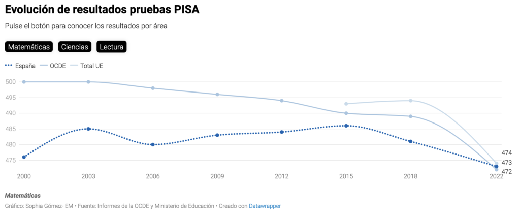 Los alumnos españoles de 15 años han caído en todas las materias de las que se han examinado en el Informe PISA y han tocado fondo en Matemáticas y Ciencias, obteniendo los peores resultados académicos de su historia. El desplome es general en casi toda Europa -sólo mejoran los asiáticos- y se atribuye en parte a los efectos del cierre de colegios durante el Covid, pero la OCDE apunta a más factores, como el abuso de los teléfonos móviles y de las pantallas en las escuelas o el descenso en la implicación de los padres en el progreso académico de sus hijos. Los expertos consultados también señalan a una pérdida de la excelencia y a una relajación de la exigencia en el sistema educativo.